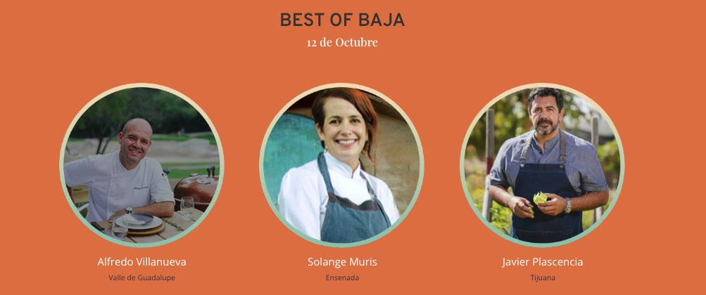 Chefs: Alfredo Villanueva (Valle de Guadalupe), Solange Muris (Ensenada) y Javier Plascencia (Tijuana); maridaje a cargo de Sommeliers Manuel Negrete y Steve Ayón.