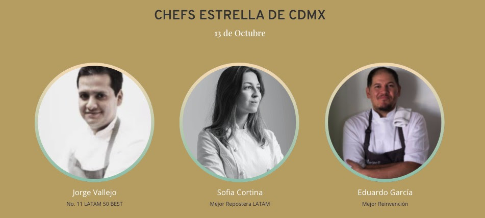 Chefs: Jorge Vallejo (Número 11 de Latam 50 Best), Sofía Cortina (Mejor repostera de Latinoamérica) y Eduardo García (Estrella Damm Chef´s Choice y premiado como Best Reinvention); maridaje a cargo de Sommeliers Johan Valderrábano y Miguel Ángel Maldonado.