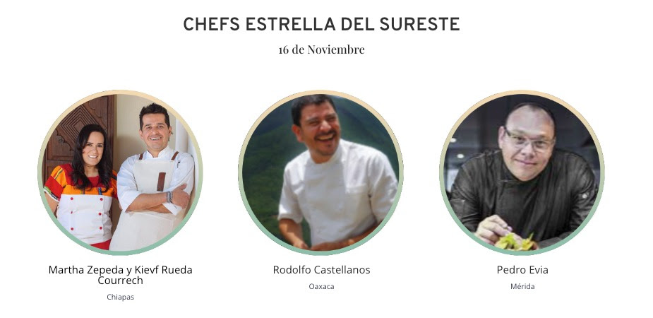 Chefs: Martha Zepeda (Chiapas), Kievf Rueda Courrech (Chiapas), Rodolfo Castellanos (Oaxaca), Pedro Evia (Yucatán); maridaje a cargo de Sommeliers Areli Curiel y Steve Ayon.