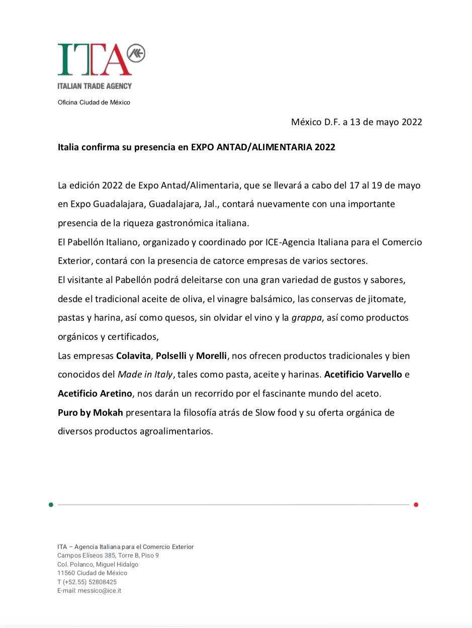 ITALIA CONFIRMA SU PRESENCIA EN EXPO ANTAD & ALIMENTARIA MÉXICO 2022 Publicado por Nestor Rodriguez | May 18, 2022 | Colaboraciones, Eventos, Noticias | 0 |