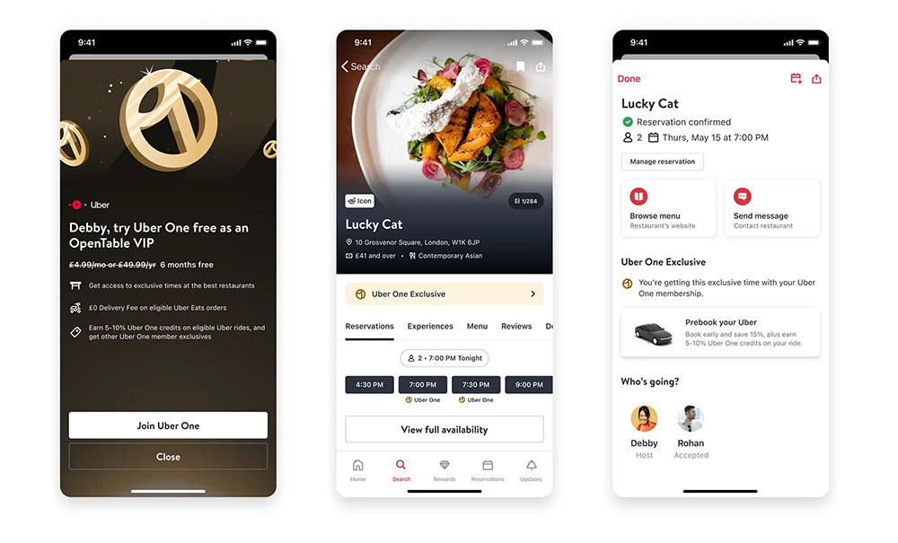 Próximamente: al hacer una reservación a través de OpenTable, el usuario recibirá un descuento en su viaje con Uber rumbo al restaurante. Además, en algunos mercados, podrá usar sus puntos de OpenTable para pagar viajes con Uber.