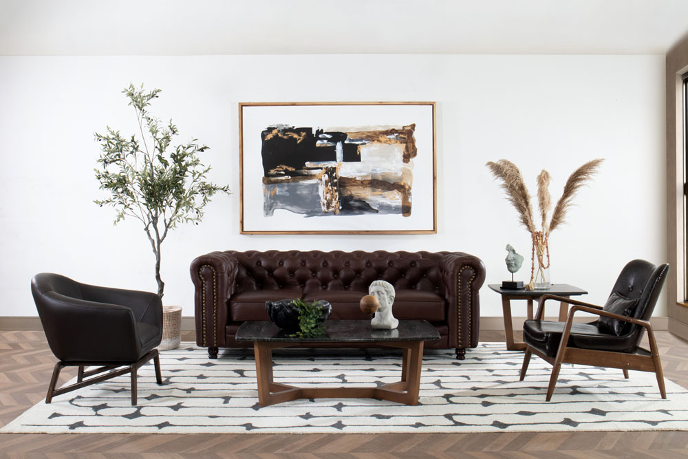 El sofá ‘Chesterfield’ es un clásico de la decoración inglesa que no solo persiste hasta nuestros días, sino que se ha apropiado del término ‘sofá’. Este modelo se caracteriza por disponer de unas botonaduras artesanales con uniones que configuran rombos en toda su estructura. Posee un respaldo muy bajo, a la altura de los reposabrazos, que a su vez tiene aplicación artesanal de tachuela individual. Es un sofá que transpira nobleza y suntuosidad, fabricado para durar muchísimos años.  El Sofá de Piel Windsor Café, fiel al modelo original de cuero marrón, es una declaración definitiva del buen gusto atemporal.