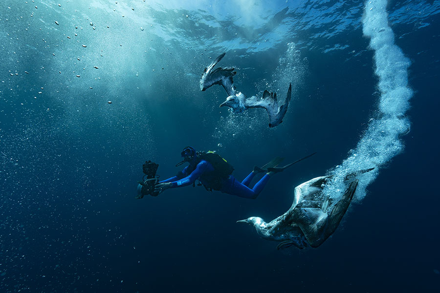 South Africa. During the world’s largest animal migration. Cameraman diver Steven from the UNESCO & 1OCEAN team finds himself between the dives of Cape Gannets in search of sardines.